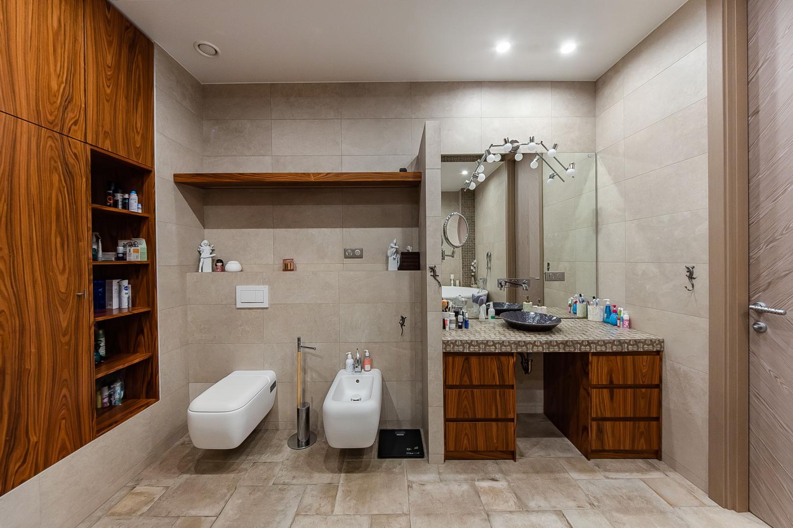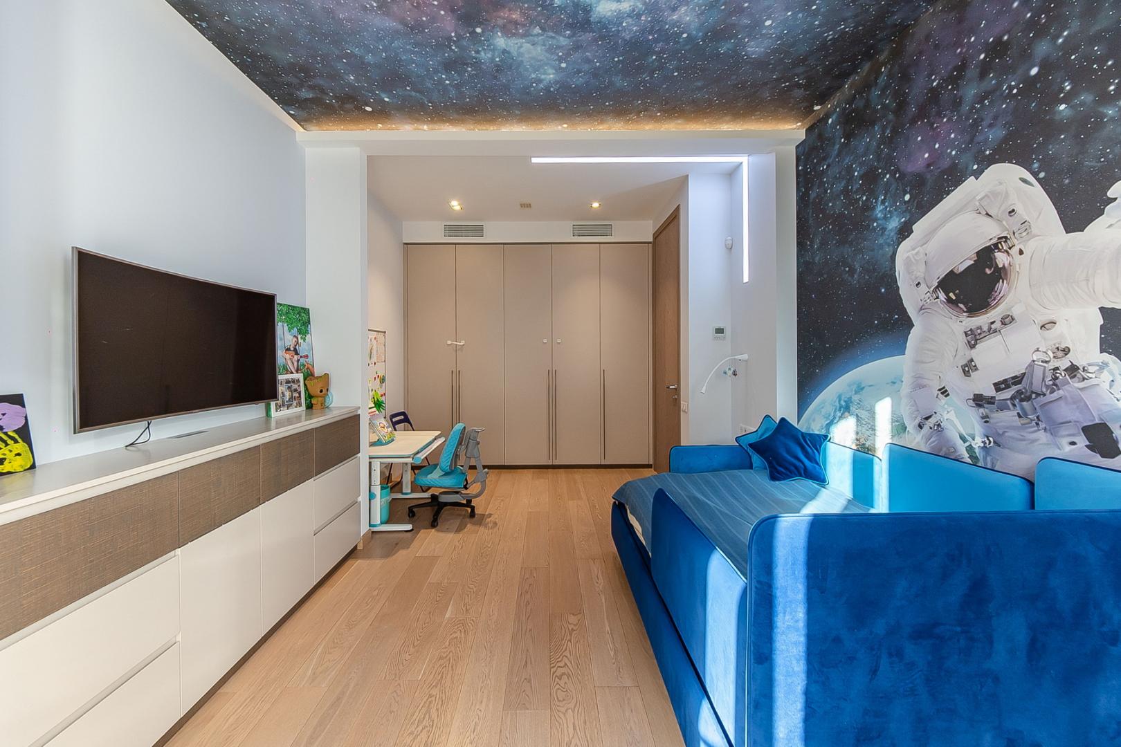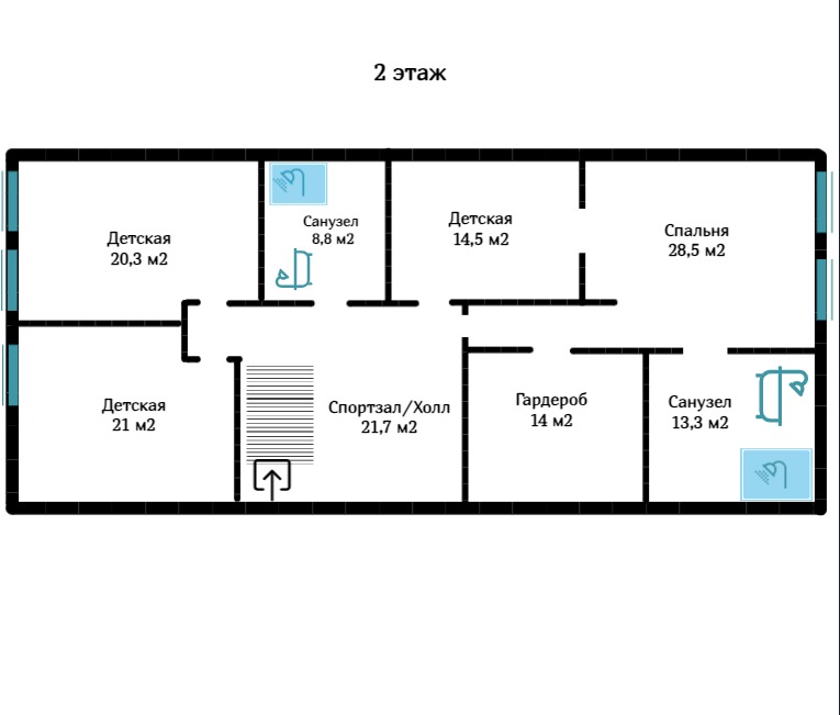 Два с/у- 13.3 м2, 8.8 м2( в каждом есть ванна и душевая кабина); гардеробная- 14 м2, спортзал/холл-10.7м2.
