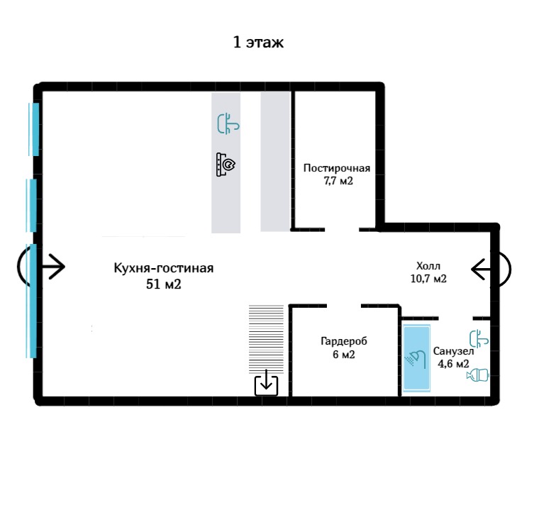 1 этаж: гостиная(кухня-столовая)- 51 м2; гардеробная-6м2; с/у-4.6 м2 (с душевой кабиной); постирочная-7.7 м2.